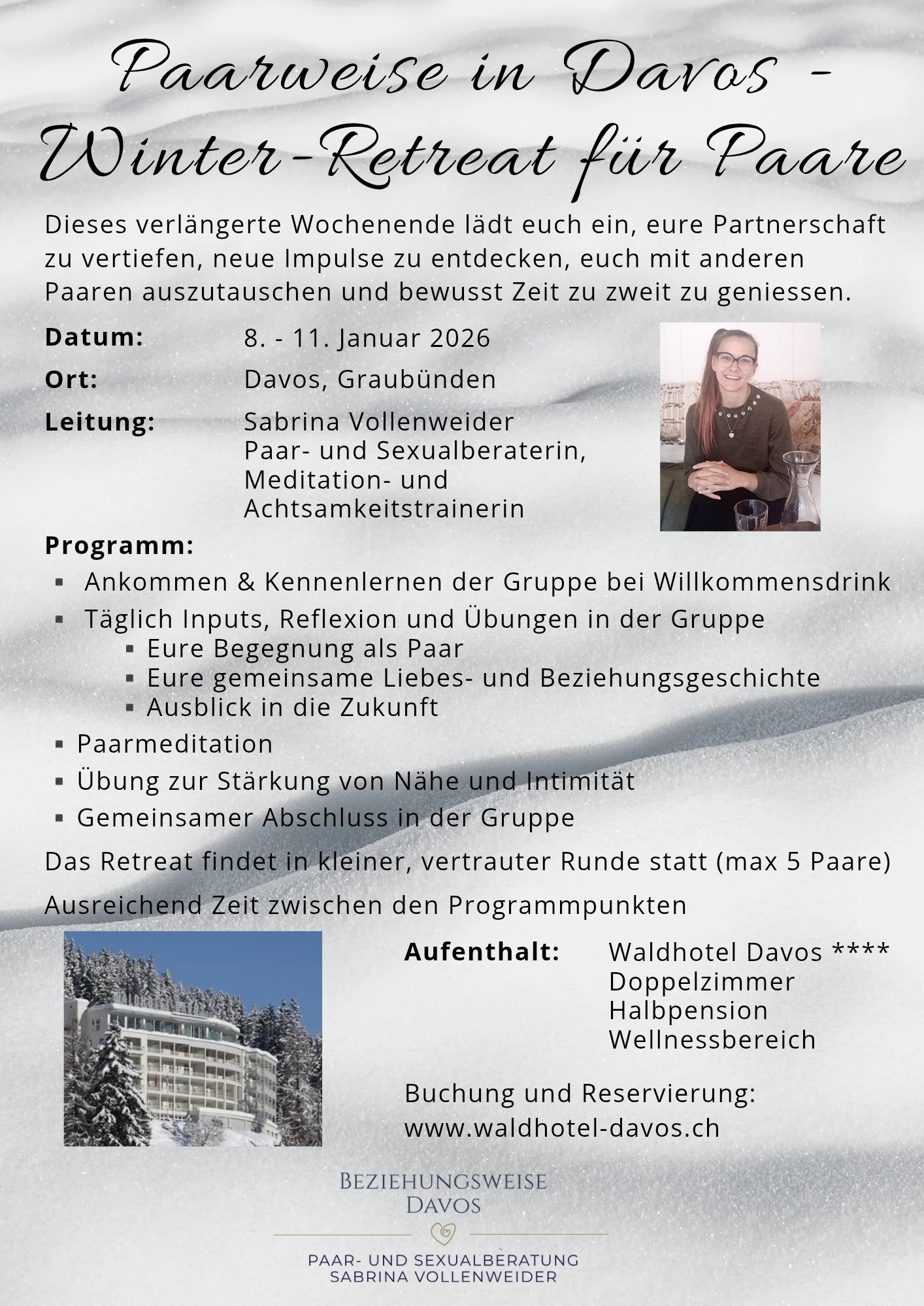 Dieses verlängerte Wochenende (8. - 11.1.) lädt Euch ein, Eure Partnerschaft zu vertiefen, neue Impulse zu entdecken, Euch mit anderen Paaren auszutauschen und bewusst Zeit zu zweit zu geniessen.