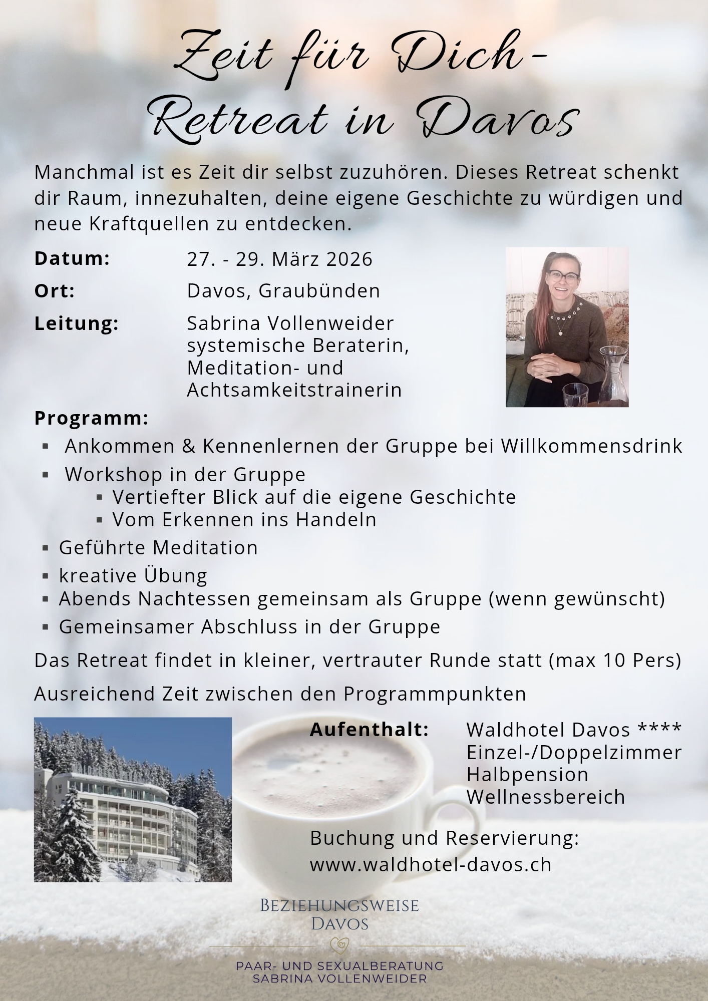 Sabrina Vollenweider, Coach und Anbieterin dieses Retreats, ist systemische Beraterin für Paare, Familien und Einzelpersonen in Davos. Sie sagt über sich: